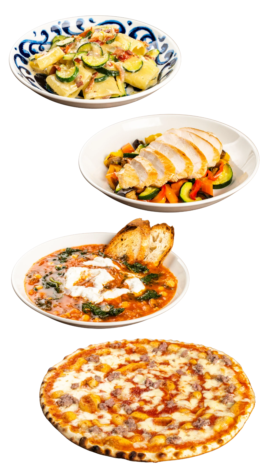 Scegli ogni giorno tra primi, secondi, piatti unici e pizze, preparati con ingredienti freschi e stagionali.