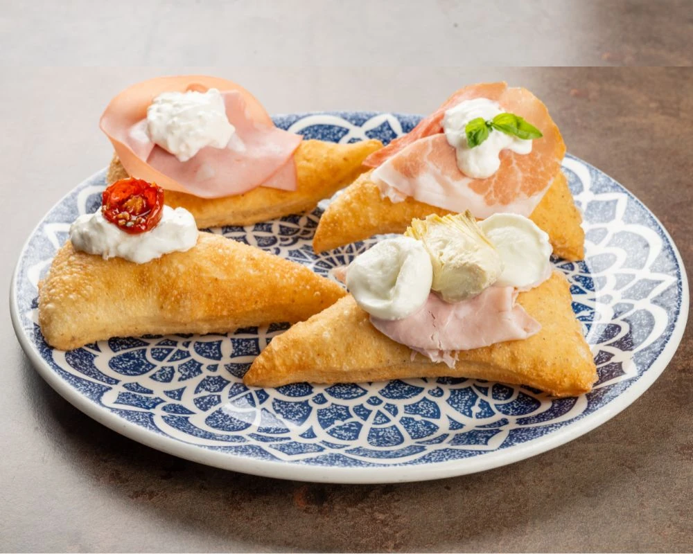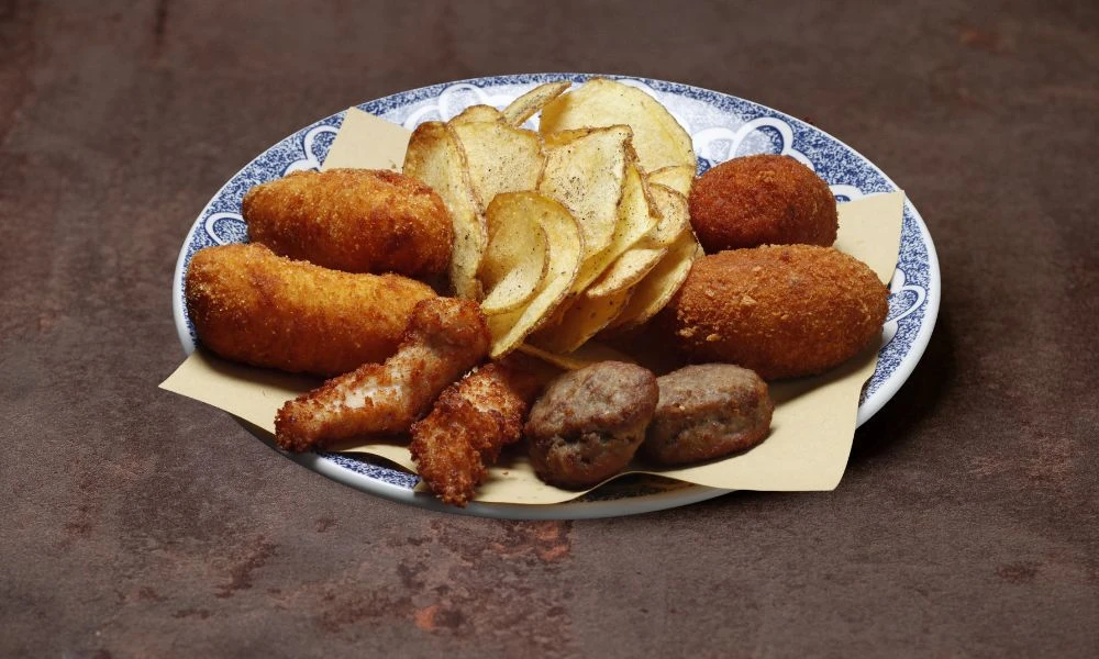 Supplì (2pz.), crocchette di patate (2pz.), filetti di pollo croccanti (2pz.), polpette (2pz.), patate liffe